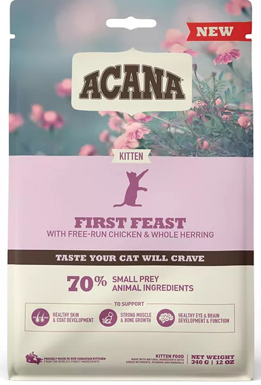 Balanced Omega fatty acids to support healthy skin and a shiny coat. With high quality protein to support muscle and bone growth as well as development. For healthy eye and brain development and function Acana First Feast contains Taurine, EPA and DHA.