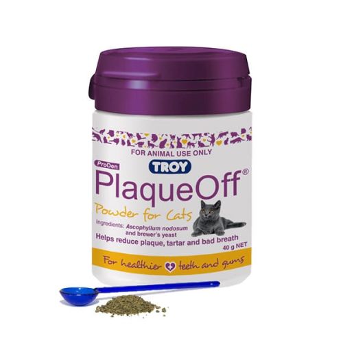 PlaqueOff Powder for Cats is for the maintenance of oral hygiene, preventing tartar, gingivitis and bad breath. Use in conjunction with brushing. Aids in softening and removal of existing tartar build up and prevents new tartar from forming, reducing gum disease and bad breath.