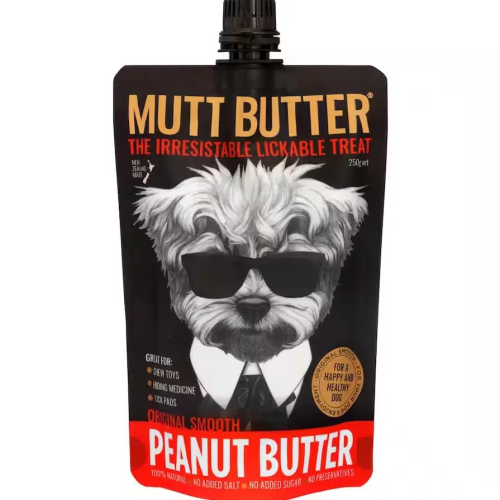 Made in New Zealand Mutt Butter Original Peanut Butter is 100% natural peanut butter with no added salt or sugar. Peanuts are naturally loaded with good oils and minerals; they have 25% protein which, along with the oils, aids your dogs overall health. Mutt Butter Peanut Butter is ideal for feeding dogs their medicine, filling dog chew toys, lick pads or making frozen or baked treats and supplementing meals.