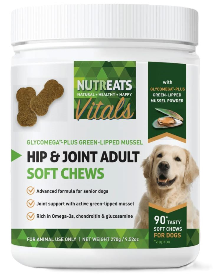 Nutreats Hip & Joint Adult Soft Chews for dogs contain a blend of powerful natural ingredients that may help support flexibility, mobility and comfort for your dog. These tasty soft chews contain high-strength, premium New Zealand green-lipped mussel powder, with chondroitin, Omega-3s, glucosamine, vitamin C and kelp, that may help support healthy joints.