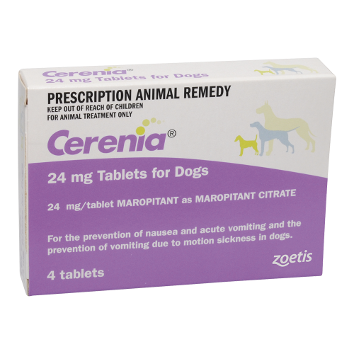 Cerenia is indicated for the prevention of acute vomiting and prevention of vomiting due to motion sickness in dogs.