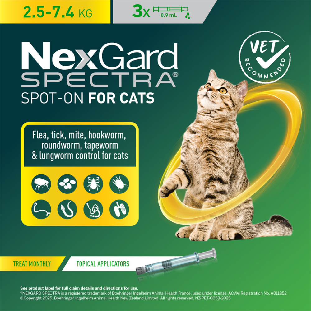 [{"id":47416222974173,"title":"1-Pack","option1":"1-Pack","option2":null,"option3":null,"sku":"19854","requires_shipping":true,"taxable":true,"featured_image":{"id":45191134347485,"product_id":9073072537821,"position":1,"created_at":"2025-10-06T13:39:09+13:00","updated_at":"2025-10-06T13:39:12+13:00","alt":null,"width":381,"height":500,"src":"\/\/myvet.co.nz\/cdn\/shop\/files\/nexgard-spectra-cat-single-myvet_discount_cheapest-2023.jpg?v=1759711152","variant_ids":[47416222974173]},"available":true,"name":"NexGard SPECTRA for Large Cats 2.5-7.4kg - 1-Pack","public_title":"1-Pack","options":["1-Pack"],"price":2205,"weight":30,"compare_at_price":3000,"inventory_management":"shopify","barcode":"9416270990278","featured_media":{"alt":null,"id":36804005036253,"position":1,"preview_image":{"aspect_ratio":0.762,"height":500,"width":381,"src":"\/\/myvet.co.nz\/cdn\/shop\/files\/nexgard-spectra-cat-single-myvet_discount_cheapest-2023.jpg?v=1759711152"}},"requires_selling_plan":false,"selling_plan_allocations":[{"price_adjustments":[{"position":1,"price":2205}],"price":2205,"compare_at_price":2205,"per_delivery_price":2205,"selling_plan_id":6425280733,"selling_plan_group_id":"e9b3217990f4e2f70c100528328d4c2687e5016f"},{"price_adjustments":[{"position":1,"price":2205}],"price":2205,"compare_at_price":2205,"per_delivery_price":2205,"selling_plan_id":6425313501,"selling_plan_group_id":"e9b3217990f4e2f70c100528328d4c2687e5016f"},{"price_adjustments":[{"position":1,"price":2205}],"price":2205,"compare_at_price":2205,"per_delivery_price":2205,"selling_plan_id":6425346269,"selling_plan_group_id":"e9b3217990f4e2f70c100528328d4c2687e5016f"},{"price_adjustments":[{"position":1,"price":2205}],"price":2205,"compare_at_price":2205,"per_delivery_price":2205,"selling_plan_id":6425379037,"selling_plan_group_id":"e9b3217990f4e2f70c100528328d4c2687e5016f"},{"price_adjustments":[{"position":1,"price":2205}],"price":2205,"compare_at_price":2205,"per_delivery_price":2205,"selling_plan_id":6425411805,"selling_plan_group_id":"e9b3217990f4e2f70c100528328d4c2687e5016f"},{"price_adjustments":[{"position":1,"price":2205}],"price":2205,"compare_at_price":2205,"per_delivery_price":2205,"selling_plan_id":6425444573,"selling_plan_group_id":"e9b3217990f4e2f70c100528328d4c2687e5016f"},{"price_adjustments":[{"position":1,"price":2205}],"price":2205,"compare_at_price":2205,"per_delivery_price":2205,"selling_plan_id":6425477341,"selling_plan_group_id":"e9b3217990f4e2f70c100528328d4c2687e5016f"}],"quantity_rule":{"min":1,"max":null,"increment":1}},{"id":47416223006941,"title":"3-Pack","option1":"3-Pack","option2":null,"option3":null,"sku":"19432","requires_shipping":true,"taxable":true,"featured_image":{"id":46224812277981,"product_id":9073072537821,"position":2,"created_at":"2026-02-16T16:30:05+13:00","updated_at":"2026-02-16T16:30:06+13:00","alt":null,"width":500,"height":500,"src":"\/\/myvet.co.nz\/cdn\/shop\/files\/biah_nexgard_spectra_cat_packshot_2022_1_113db8a5-a3ed-41b4-b339-364db52d060d.jpg?v=1771212606","variant_ids":[47416223006941]},"available":true,"name":"NexGard SPECTRA for Large Cats 2.5-7.4kg - 3-Pack","public_title":"3-Pack","options":["3-Pack"],"price":6384,"weight":90,"compare_at_price":8000,"inventory_management":"shopify","barcode":"9416270990247","featured_media":{"alt":null,"id":37785718456541,"position":2,"preview_image":{"aspect_ratio":1.0,"height":500,"width":500,"src":"\/\/myvet.co.nz\/cdn\/shop\/files\/biah_nexgard_spectra_cat_packshot_2022_1_113db8a5-a3ed-41b4-b339-364db52d060d.jpg?v=1771212606"}},"requires_selling_plan":false,"selling_plan_allocations":[{"price_adjustments":[{"position":1,"price":6384}],"price":6384,"compare_at_price":6384,"per_delivery_price":6384,"selling_plan_id":6425280733,"selling_plan_group_id":"e9b3217990f4e2f70c100528328d4c2687e5016f"},{"price_adjustments":[{"position":1,"price":6384}],"price":6384,"compare_at_price":6384,"per_delivery_price":6384,"selling_plan_id":6425313501,"selling_plan_group_id":"e9b3217990f4e2f70c100528328d4c2687e5016f"},{"price_adjustments":[{"position":1,"price":6384}],"price":6384,"compare_at_price":6384,"per_delivery_price":6384,"selling_plan_id":6425346269,"selling_plan_group_id":"e9b3217990f4e2f70c100528328d4c2687e5016f"},{"price_adjustments":[{"position":1,"price":6384}],"price":6384,"compare_at_price":6384,"per_delivery_price":6384,"selling_plan_id":6425379037,"selling_plan_group_id":"e9b3217990f4e2f70c100528328d4c2687e5016f"},{"price_adjustments":[{"position":1,"price":6384}],"price":6384,"compare_at_price":6384,"per_delivery_price":6384,"selling_plan_id":6425411805,"selling_plan_group_id":"e9b3217990f4e2f70c100528328d4c2687e5016f"},{"price_adjustments":[{"position":1,"price":6384}],"price":6384,"compare_at_price":6384,"per_delivery_price":6384,"selling_plan_id":6425444573,"selling_plan_group_id":"e9b3217990f4e2f70c100528328d4c2687e5016f"},{"price_adjustments":[{"position":1,"price":6384}],"price":6384,"compare_at_price":6384,"per_delivery_price":6384,"selling_plan_id":6425477341,"selling_plan_group_id":"e9b3217990f4e2f70c100528328d4c2687e5016f"}],"quantity_rule":{"min":1,"max":null,"increment":1}}]