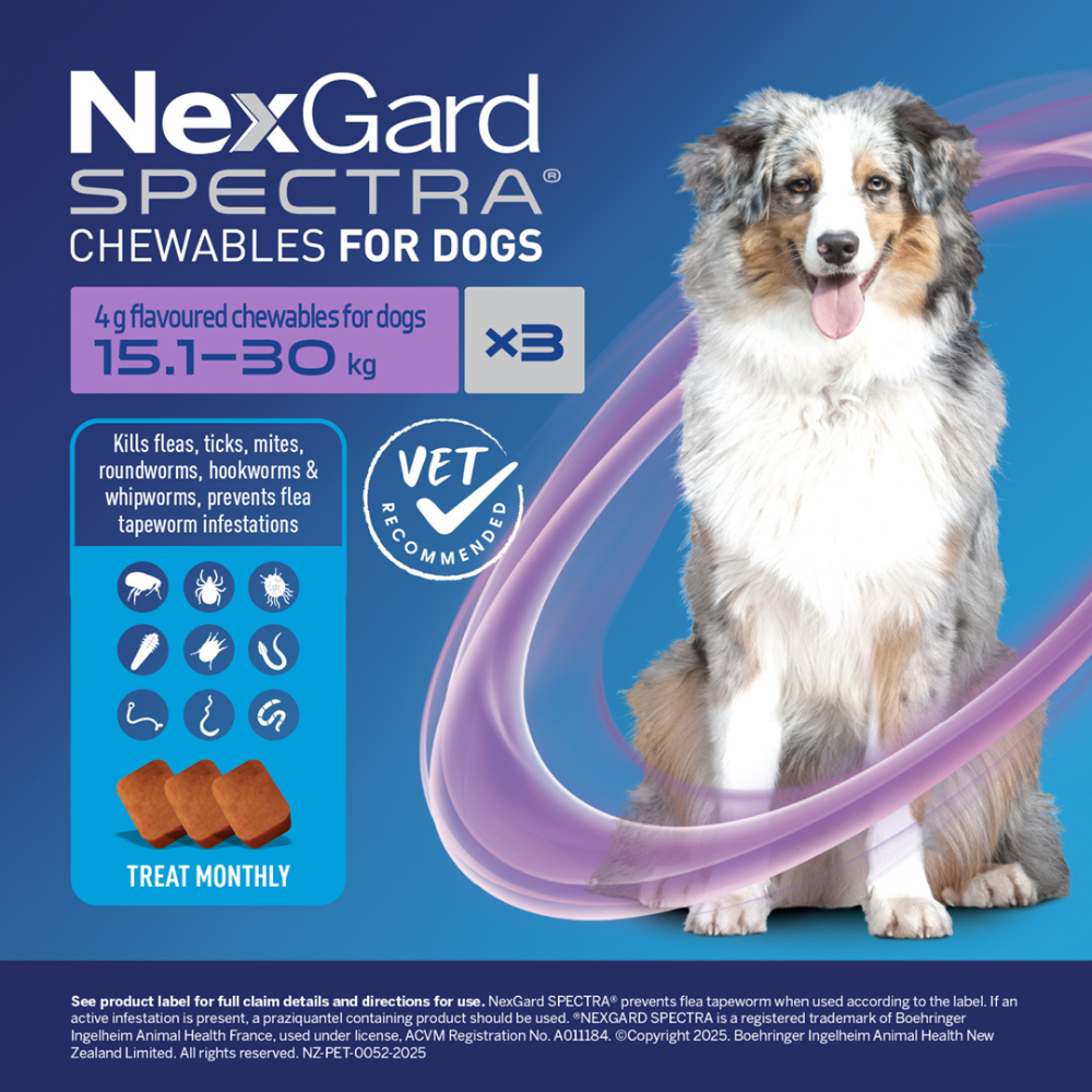 [{"id":47388179005661,"title":"1-Pack","option1":"1-Pack","option2":null,"option3":null,"sku":"1510","requires_shipping":true,"taxable":true,"featured_image":{"id":45267774865629,"product_id":9131702288605,"position":1,"created_at":"2025-10-15T20:53:56+13:00","updated_at":"2025-10-15T20:53:59+13:00","alt":null,"width":381,"height":500,"src":"\/\/myvet.co.nz\/cdn\/shop\/files\/biah_nexgard_spectra_full_version_large_dog_1pk_2022.png?v=1760514839","variant_ids":[47388179005661]},"available":true,"name":"NexGard SPECTRA for Large Dogs 15.1-30kg - 1-Pack","public_title":"1-Pack","options":["1-Pack"],"price":2310,"weight":15,"compare_at_price":3299,"inventory_management":"shopify","barcode":"9421005652529","featured_media":{"alt":null,"id":36879425568989,"position":1,"preview_image":{"aspect_ratio":0.762,"height":500,"width":381,"src":"\/\/myvet.co.nz\/cdn\/shop\/files\/biah_nexgard_spectra_full_version_large_dog_1pk_2022.png?v=1760514839"}},"requires_selling_plan":false,"selling_plan_allocations":[{"price_adjustments":[{"position":1,"price":2310}],"price":2310,"compare_at_price":2310,"per_delivery_price":2310,"selling_plan_id":6425280733,"selling_plan_group_id":"e9b3217990f4e2f70c100528328d4c2687e5016f"},{"price_adjustments":[{"position":1,"price":2310}],"price":2310,"compare_at_price":2310,"per_delivery_price":2310,"selling_plan_id":6425313501,"selling_plan_group_id":"e9b3217990f4e2f70c100528328d4c2687e5016f"},{"price_adjustments":[{"position":1,"price":2310}],"price":2310,"compare_at_price":2310,"per_delivery_price":2310,"selling_plan_id":6425346269,"selling_plan_group_id":"e9b3217990f4e2f70c100528328d4c2687e5016f"},{"price_adjustments":[{"position":1,"price":2310}],"price":2310,"compare_at_price":2310,"per_delivery_price":2310,"selling_plan_id":6425379037,"selling_plan_group_id":"e9b3217990f4e2f70c100528328d4c2687e5016f"},{"price_adjustments":[{"position":1,"price":2310}],"price":2310,"compare_at_price":2310,"per_delivery_price":2310,"selling_plan_id":6425411805,"selling_plan_group_id":"e9b3217990f4e2f70c100528328d4c2687e5016f"},{"price_adjustments":[{"position":1,"price":2310}],"price":2310,"compare_at_price":2310,"per_delivery_price":2310,"selling_plan_id":6425444573,"selling_plan_group_id":"e9b3217990f4e2f70c100528328d4c2687e5016f"},{"price_adjustments":[{"position":1,"price":2310}],"price":2310,"compare_at_price":2310,"per_delivery_price":2310,"selling_plan_id":6425477341,"selling_plan_group_id":"e9b3217990f4e2f70c100528328d4c2687e5016f"}],"quantity_rule":{"min":1,"max":null,"increment":1}},{"id":47388179038429,"title":"3-Pack","option1":"3-Pack","option2":null,"option3":null,"sku":"1493","requires_shipping":true,"taxable":true,"featured_image":{"id":46165971402973,"product_id":9131702288605,"position":2,"created_at":"2026-02-12T17:09:29+13:00","updated_at":"2026-02-12T17:09:30+13:00","alt":null,"width":381,"height":500,"src":"\/\/myvet.co.nz\/cdn\/shop\/files\/biah_nexgard_spectra_full_version_large_dog_3pk_2022_7abf5514-2948-4c4f-ad6d-c2b6a817ce0d.png?v=1770869370","variant_ids":[47388179038429]},"available":true,"name":"NexGard SPECTRA for Large Dogs 15.1-30kg - 3-Pack","public_title":"3-Pack","options":["3-Pack"],"price":6309,"weight":15,"compare_at_price":7900,"inventory_management":"shopify","barcode":"9421005652536","featured_media":{"alt":null,"id":37731916447965,"position":2,"preview_image":{"aspect_ratio":0.762,"height":500,"width":381,"src":"\/\/myvet.co.nz\/cdn\/shop\/files\/biah_nexgard_spectra_full_version_large_dog_3pk_2022_7abf5514-2948-4c4f-ad6d-c2b6a817ce0d.png?v=1770869370"}},"requires_selling_plan":false,"selling_plan_allocations":[{"price_adjustments":[{"position":1,"price":6309}],"price":6309,"compare_at_price":6309,"per_delivery_price":6309,"selling_plan_id":6425280733,"selling_plan_group_id":"e9b3217990f4e2f70c100528328d4c2687e5016f"},{"price_adjustments":[{"position":1,"price":6309}],"price":6309,"compare_at_price":6309,"per_delivery_price":6309,"selling_plan_id":6425313501,"selling_plan_group_id":"e9b3217990f4e2f70c100528328d4c2687e5016f"},{"price_adjustments":[{"position":1,"price":6309}],"price":6309,"compare_at_price":6309,"per_delivery_price":6309,"selling_plan_id":6425346269,"selling_plan_group_id":"e9b3217990f4e2f70c100528328d4c2687e5016f"},{"price_adjustments":[{"position":1,"price":6309}],"price":6309,"compare_at_price":6309,"per_delivery_price":6309,"selling_plan_id":6425379037,"selling_plan_group_id":"e9b3217990f4e2f70c100528328d4c2687e5016f"},{"price_adjustments":[{"position":1,"price":6309}],"price":6309,"compare_at_price":6309,"per_delivery_price":6309,"selling_plan_id":6425411805,"selling_plan_group_id":"e9b3217990f4e2f70c100528328d4c2687e5016f"},{"price_adjustments":[{"position":1,"price":6309}],"price":6309,"compare_at_price":6309,"per_delivery_price":6309,"selling_plan_id":6425444573,"selling_plan_group_id":"e9b3217990f4e2f70c100528328d4c2687e5016f"},{"price_adjustments":[{"position":1,"price":6309}],"price":6309,"compare_at_price":6309,"per_delivery_price":6309,"selling_plan_id":6425477341,"selling_plan_group_id":"e9b3217990f4e2f70c100528328d4c2687e5016f"}],"quantity_rule":{"min":1,"max":null,"increment":1}}]