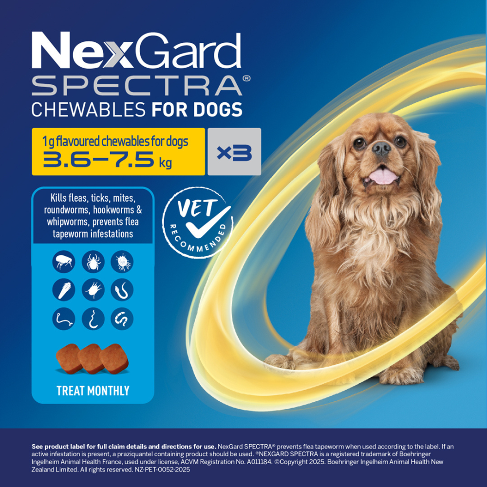 [{"id":47388764569821,"title":"1-Pack","option1":"1-Pack","option2":null,"option3":null,"sku":"1507","requires_shipping":true,"taxable":true,"featured_image":{"id":45267775455453,"product_id":9073072505053,"position":1,"created_at":"2025-10-15T20:53:59+13:00","updated_at":"2025-10-15T20:54:02+13:00","alt":null,"width":381,"height":500,"src":"\/\/myvet.co.nz\/cdn\/shop\/files\/biah_nexgard_spectra_full_version_small_dog_1pk_2022.png?v=1760514842","variant_ids":[47388764569821]},"available":true,"name":"NexGard SPECTRA for Small Dogs 3.6-7.5kg - 1-Pack","public_title":"1-Pack","options":["1-Pack"],"price":2000,"weight":15,"compare_at_price":3099,"inventory_management":"shopify","barcode":"9421005652482","featured_media":{"alt":null,"id":36879426158813,"position":1,"preview_image":{"aspect_ratio":0.762,"height":500,"width":381,"src":"\/\/myvet.co.nz\/cdn\/shop\/files\/biah_nexgard_spectra_full_version_small_dog_1pk_2022.png?v=1760514842"}},"requires_selling_plan":false,"selling_plan_allocations":[{"price_adjustments":[{"position":1,"price":2000}],"price":2000,"compare_at_price":2000,"per_delivery_price":2000,"selling_plan_id":6425280733,"selling_plan_group_id":"e9b3217990f4e2f70c100528328d4c2687e5016f"},{"price_adjustments":[{"position":1,"price":2000}],"price":2000,"compare_at_price":2000,"per_delivery_price":2000,"selling_plan_id":6425313501,"selling_plan_group_id":"e9b3217990f4e2f70c100528328d4c2687e5016f"},{"price_adjustments":[{"position":1,"price":2000}],"price":2000,"compare_at_price":2000,"per_delivery_price":2000,"selling_plan_id":6425346269,"selling_plan_group_id":"e9b3217990f4e2f70c100528328d4c2687e5016f"},{"price_adjustments":[{"position":1,"price":2000}],"price":2000,"compare_at_price":2000,"per_delivery_price":2000,"selling_plan_id":6425379037,"selling_plan_group_id":"e9b3217990f4e2f70c100528328d4c2687e5016f"},{"price_adjustments":[{"position":1,"price":2000}],"price":2000,"compare_at_price":2000,"per_delivery_price":2000,"selling_plan_id":6425411805,"selling_plan_group_id":"e9b3217990f4e2f70c100528328d4c2687e5016f"},{"price_adjustments":[{"position":1,"price":2000}],"price":2000,"compare_at_price":2000,"per_delivery_price":2000,"selling_plan_id":6425444573,"selling_plan_group_id":"e9b3217990f4e2f70c100528328d4c2687e5016f"},{"price_adjustments":[{"position":1,"price":2000}],"price":2000,"compare_at_price":2000,"per_delivery_price":2000,"selling_plan_id":6425477341,"selling_plan_group_id":"e9b3217990f4e2f70c100528328d4c2687e5016f"}],"quantity_rule":{"min":1,"max":null,"increment":1}},{"id":47388764602589,"title":"3-Pack","option1":"3-Pack","option2":null,"option3":null,"sku":"1499","requires_shipping":true,"taxable":true,"featured_image":{"id":46166627221725,"product_id":9073072505053,"position":2,"created_at":"2026-02-12T17:44:13+13:00","updated_at":"2026-02-12T17:44:15+13:00","alt":null,"width":381,"height":500,"src":"\/\/myvet.co.nz\/cdn\/shop\/files\/biah_nexgard_spectra_full_version_small_dog_3pk_2022_b248f652-4821-4048-8151-dbbcef8d5b8c.png?v=1770871455","variant_ids":[47388764602589]},"available":true,"name":"NexGard SPECTRA for Small Dogs 3.6-7.5kg - 3-Pack","public_title":"3-Pack","options":["3-Pack"],"price":5882,"weight":15,"compare_at_price":7199,"inventory_management":"shopify","barcode":"9421005652499","featured_media":{"alt":null,"id":37732429037789,"position":2,"preview_image":{"aspect_ratio":0.762,"height":500,"width":381,"src":"\/\/myvet.co.nz\/cdn\/shop\/files\/biah_nexgard_spectra_full_version_small_dog_3pk_2022_b248f652-4821-4048-8151-dbbcef8d5b8c.png?v=1770871455"}},"requires_selling_plan":false,"selling_plan_allocations":[{"price_adjustments":[{"position":1,"price":5882}],"price":5882,"compare_at_price":5882,"per_delivery_price":5882,"selling_plan_id":6425280733,"selling_plan_group_id":"e9b3217990f4e2f70c100528328d4c2687e5016f"},{"price_adjustments":[{"position":1,"price":5882}],"price":5882,"compare_at_price":5882,"per_delivery_price":5882,"selling_plan_id":6425313501,"selling_plan_group_id":"e9b3217990f4e2f70c100528328d4c2687e5016f"},{"price_adjustments":[{"position":1,"price":5882}],"price":5882,"compare_at_price":5882,"per_delivery_price":5882,"selling_plan_id":6425346269,"selling_plan_group_id":"e9b3217990f4e2f70c100528328d4c2687e5016f"},{"price_adjustments":[{"position":1,"price":5882}],"price":5882,"compare_at_price":5882,"per_delivery_price":5882,"selling_plan_id":6425379037,"selling_plan_group_id":"e9b3217990f4e2f70c100528328d4c2687e5016f"},{"price_adjustments":[{"position":1,"price":5882}],"price":5882,"compare_at_price":5882,"per_delivery_price":5882,"selling_plan_id":6425411805,"selling_plan_group_id":"e9b3217990f4e2f70c100528328d4c2687e5016f"},{"price_adjustments":[{"position":1,"price":5882}],"price":5882,"compare_at_price":5882,"per_delivery_price":5882,"selling_plan_id":6425444573,"selling_plan_group_id":"e9b3217990f4e2f70c100528328d4c2687e5016f"},{"price_adjustments":[{"position":1,"price":5882}],"price":5882,"compare_at_price":5882,"per_delivery_price":5882,"selling_plan_id":6425477341,"selling_plan_group_id":"e9b3217990f4e2f70c100528328d4c2687e5016f"}],"quantity_rule":{"min":1,"max":null,"increment":1}}]