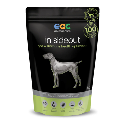 In-sideout contains a blend of natural holistic ingredients including pre & probiotics to support and optimise immune & intestinal health of your canine friends.