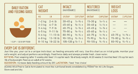 ACANA benefits cats of every variety. Just like you, your cat is unique and feeding requirements will vary with environment, age, and activity. The table below provides a starting point, to be adjusted as needed. We recommend feeding twice daily and always keeping fresh water available.
