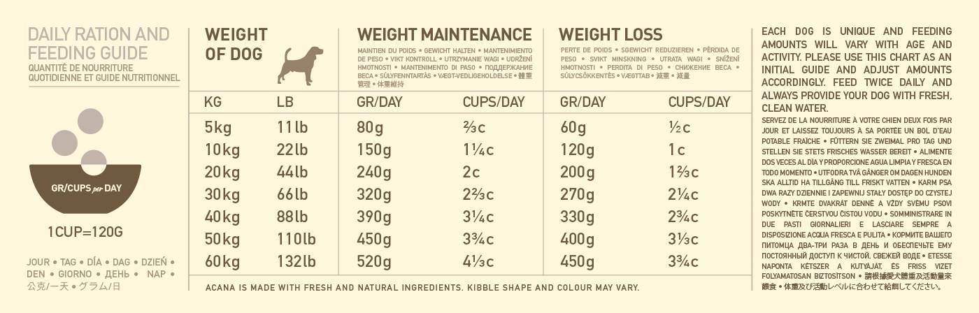 ACANA benefits dogs of every variety. Just like you, your dog is unique with feeding requirements that vary with environment, age, and activity. The table below provides a starting point, to be adjusted as needed to maintain optimum weight and peak conditioning. We suggest monitoring your dog's weight and adjusting rations as needed.