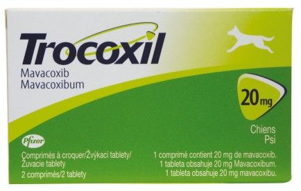 Trocoxil contains the active ingredient mavacoxib and is a relatively new treatment for osteoarthritis in dogs. Trocoxil is available in brown tablet form (with Pfizer embossed onto the tablet) and in strengths of 20mg, 30mg, 75mg or 95mg.